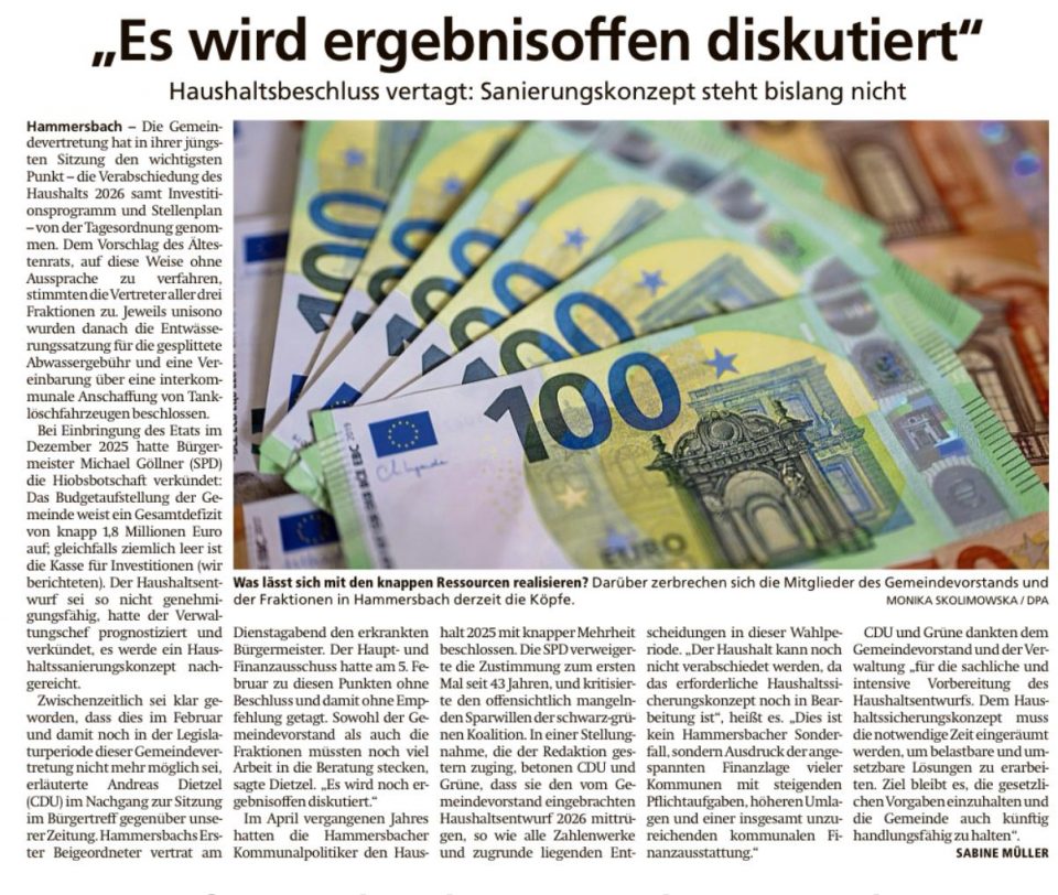 Nachdem der Haushaltsentwurf für das Jahr 2026 am vergangenen Dienstag in der Sitzung der Gemeindevertretung von der Tagesordnung genommen wurde, analysiert die SPD Hammersbach die schwierige Lage.
